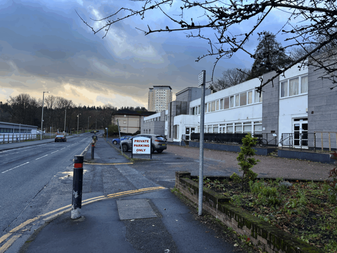 Det är tidig förmiddag på Kemper Avenue i utkanten av centrala Falkirk. Genomfartsgatan strax söder om stadens centrum är folktom, förutom ett skarpt sken. En övervakningskamera lyser rakt på mig, monterad på fasaden på en industriliknande tvåvåningsfastighet, intill en blek skylt märkt ”Reception”.