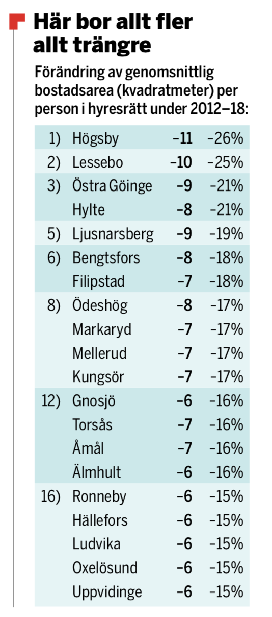 En kommun där trångboddheten har ökat påtagligt är Lessebo i Småland. Där, och i småländska Högsby, har den genomsnittliga boytan i hyresrätt minskat mest 2012–2018.