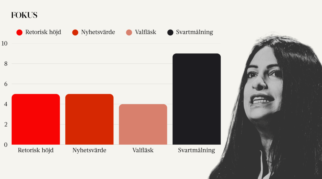 Vänsterledaren har en bra röst och ett 150-årigt kulturarv av klassiska vänstervisor, hymner, tal och paroller att ösa ur. Hon vet hur man säger ur mörkret stiga vi mot ljuset och byggde talet på denna rituellt effektiva men också banala kontrast ur Internationalen. ”Regeringen har ”lagt en mörk hand över det fantastiska Sverige” hette det, och ”mörker kan inte bekämpas med mer mörker”. Men demoniseringen blir mekanisk när regeringen sägs stå för ”hatets och våldets politik”. Det är gängvåld och aggressiva Palestinaaktivister som folk skräms av, inte Jakob Forssmed som delar ut fritidskort.