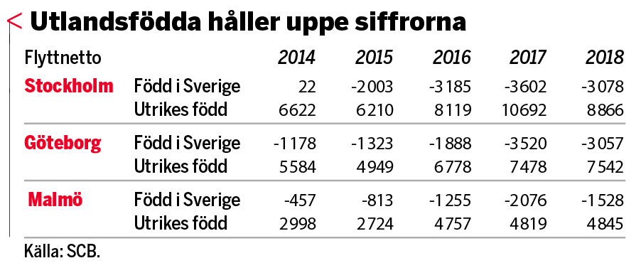 Enligt SCB:s siffror fram till sista september 2019 hade Stockholms län nära 1 000 invånare i negativt flyttnetto mot övriga landet, och 22 kommuner i länet hade ett negativt inrikes flyttnetto. Motsatsen finns hos de utlandsfödda. Studier av flyktingars flyttmönster har visat att av de som först kommer till en mindre stad eller samhälle så flyttar majoriteten till större städer inom några år.