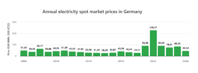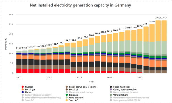 Trots att den installerade kapaciteten för vind- och solkraft nästan har tredubblats, står fossil kraft fortfarande för omkring 40 procent av Tysklands elproduktion. Under de första veckorna av 2026 stod gas- och kolkraft för hälften av elförsörjningen efter en köldknäpp plus fallande priser på utsläppsrätter.