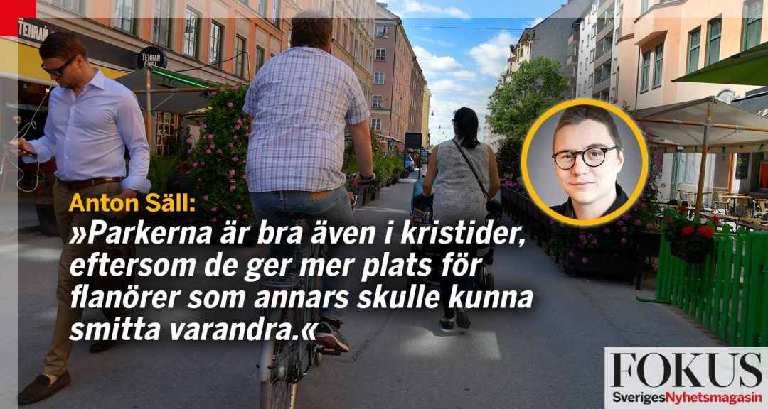 Men det här har Daniel Helldén tänkt på. Att parkerna finns är bra även i kristider, menar han, eftersom de ger mer plats för flanörer som annars skulle kunna smitta varandra.