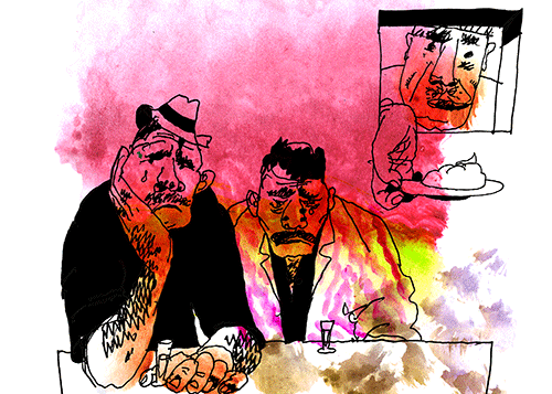 Och så plötsligt sticker Göki ut huvudet från butiken genom en liten lucka. Han börjar langa ut en massa mat. Ät! Ät! uppmanar han oss. En tallrik silkeslen hummus. Rostade grönsaker. Vitlöksstinn köfte och tomatsallad och papperstunt lavashbröd och morötter i yoghurt och det tycks aldrig ta slut … Raki! Vi måste skåla, för Gökis fru har gått över tiden och han är så nervös att han liksom dansar på fläcken och skål! Må Gökis ej än anlända barn ha tio fingrar och tio tår och få ett framgångsrikt liv. Kazakerna skålar på sitt vackra, obegripliga språk. Krustpunkarmedhjälparen skålar han också. Vi äter och vi dricker och Göki ler och ler och vankar nervöst av och an som en rar instängd best i det lilla utrymmet bakom disken.