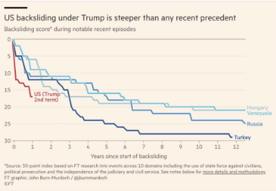 Och man begriper varför. Det är speciella tider i USA även sett från Sverige, och för en amerikansk patriot som Bruce måste landet framstå rent hallucinatoriskt. En liten graf i Financial Times i helgen visade en sorts kollaps – hur USA:s demokratikurva fallit snabbare under Donald Trump än den föll i Ungern, Ryssland och Turkiet när Orbán, Putin och Erdogan slog in på den illiberala vägen.