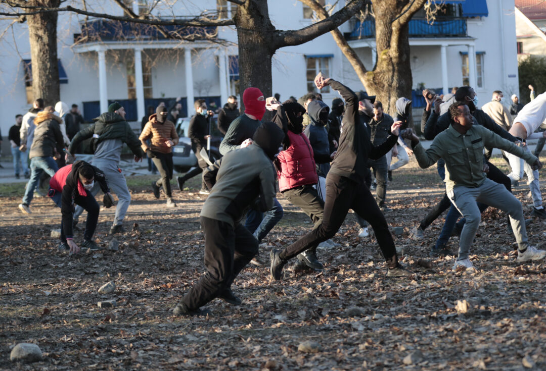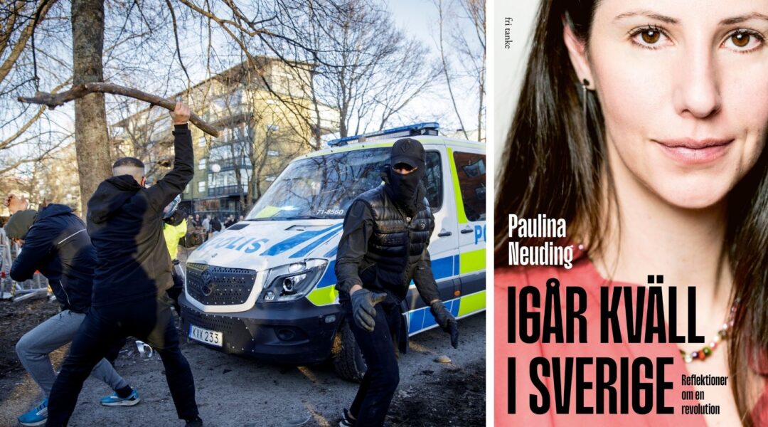 Toppbild. En polisbil angrips under kravaller i Örebro påsken 2022. Paulina Neudings debutbok handlar om den svenska samhällsutvecklingen under de senaste 20 åren. Foto: Pavel Koubek/ TT / Foto:Karl Gabor Omslag: Beatrice Bohman
