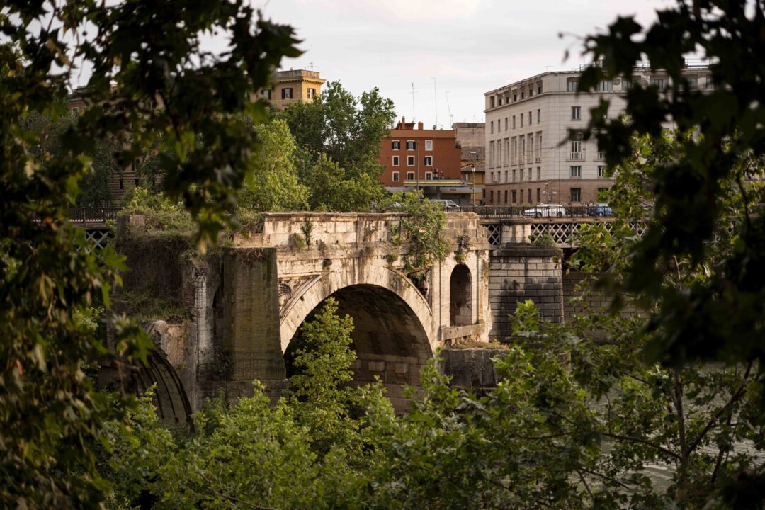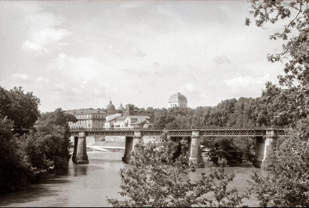 Jag tar fram min Leica IIIc och tar en bild på Ponte Palatino – en bro från 1800-talet som ersatte den över två tusen år gamla Pons Aemelius som mot slutet av sin livstid kallades Ponte Rotto – den trasiga bron.