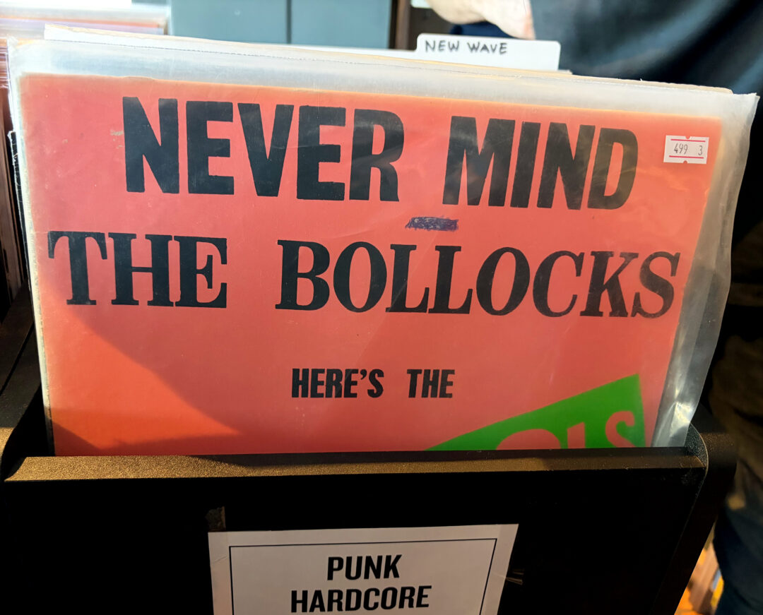 Banned Books & Co säljer också vinylskivor. Längst fram i en av backarna står punkpionjärerna Sex Pistols första och enda album Never Mind the Bollocks från 1977. Singeln God Save the Queen släpptes samtidigt som Elizabeth II firade 25 år på tronen. Bandet gick till anarkistiskt frontalangrepp mot henne och det engelska kungahuset. BBC och de fristående radiostationerna lät bli att spela låten och de stora skivbutikskedjorna sålde inte singeln. Trots det knep den andra platsen på Englandslistan, strax efter Rod Stewarts ballad I Don’t Want to Talk About It. Men den som försökte utläsa vad artisten och låten hette möttes bara av ett svart streck.