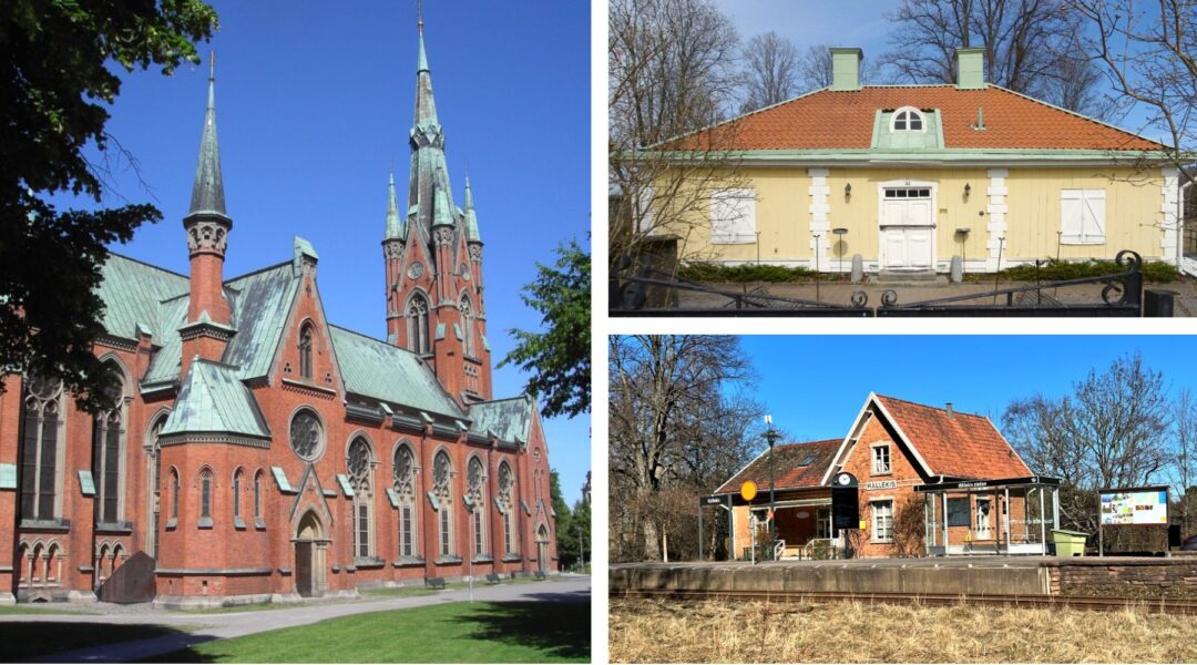 Toppbild: Matteus kyrka i Norrköping, Vendelö gård och stationshuset i Hällekis – tre exempel på svenska kulturhistoriska byggnader.
