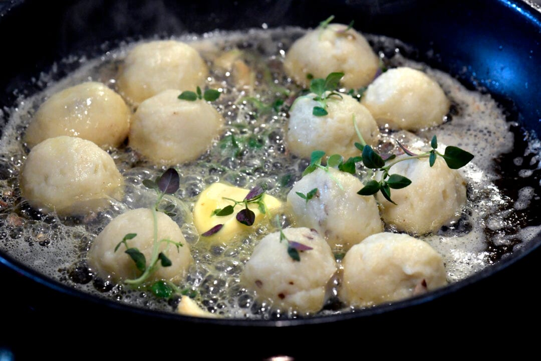 Och nu tänker vän av ordning kroppkakor, stabbiga och fyllda med fett fläsk och kryddpeppar? Nej, absolut inte, jag gör dem av finaste potatisen som små kulor, lite mindre i storlek än golfbollar och jag proppar dem knökfulla med ankrilette (en sylta på anklår som är långkokt i sitt eget fett, finns färdig som konserv i delikatessbutiken) och lite riven tryffel, alternativt ett uns rivet apelsinskal. Potatisen hjälper ankan i smak och ankan smaksätter potatisen – oerhört raffinerat. Potatis och allt slags fett är det motsatta mot lök på laxen.