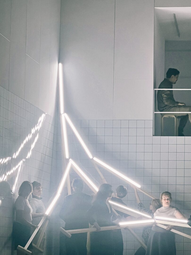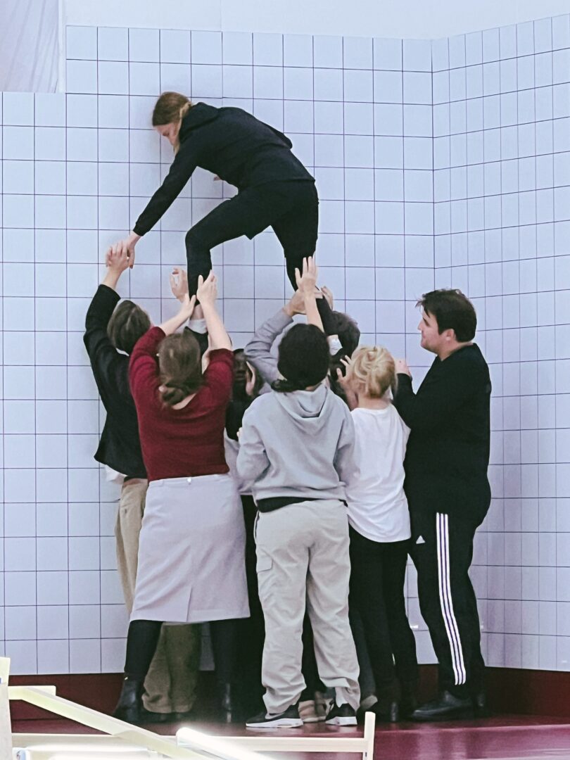 Ensemblen ska denna dag, när vi träffas för intervju, för första gången spela igenom scen för scen, utan något avbrott. De gör det till tonerna av Jonathan Johanssons nykomponerade musik. I fonden ovanför scenen finns ett mindre scenrum inbyggt, ett fikarum på en arbetsplats med en rutschkana i mitten som leder ner till stora scenens tiljor. En efter en, utspritt under hela föreställningen, kommer de elva skådespelarna och fyra dansarna kanande i hög fart nerför och studsar ut i ett vitt, kaklat scenrum – utannågra dörrar eller fönster.