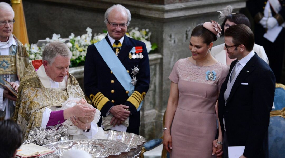Toppbild. Dåvarande ärkebiskop Anders Wejryd döper prinsessan Estelle under överinseende av kung Carl XVI Gustaf, kronprinsessan Victoria och prins Daniel i Slottskyrkan 2012. Foto: Claudio Bresciani/TT