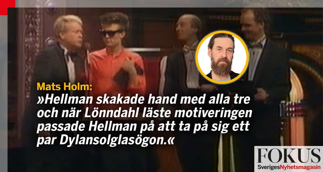 Hellman skakade hand med alla tre och när Lönndahl läste motiveringen passade Hellman på att ta på sig ett par Dylansolglasögon. Men när Lönndahl vände sig för att skaka hand med honom såg han bara hur ung pristagaren var, grep mikrofonen och sa: ”Hälsa farmor och farfar från mig”. Jag minns att jag skrattade åt det då, och nu när jag nu hittar det på Youtube blir jag på lika gott humör. Hellman garvar inte. Är cool på det där mångtydiga rockstjärnesättet, säger: ”Jag vill tacka massmedierna för min fina framgång, och Berns för att jag blev insläppt” (se klippet här!).