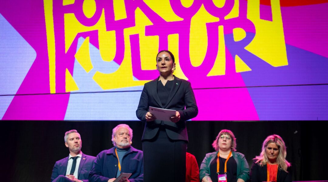 Toppbild. Kulturminister Parisa Liljestrand (M) talar på Folk och Kultur i Eskilstund 2025. DIKs rapport om kulturens finansiering släpps i samband med att årets Folk och Kultur går av stapeln 4/2. Foto: Per Bille