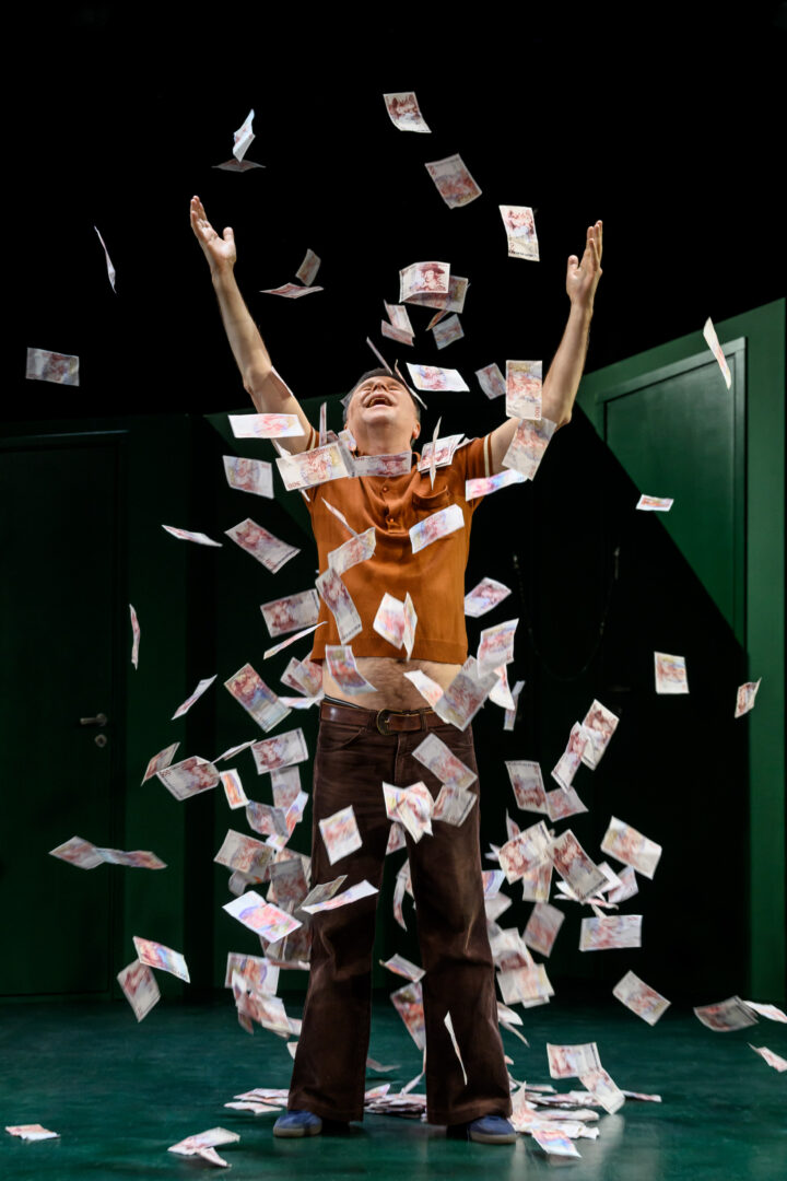 Över Scalateaterns scen sträcker sig en grön vägg som liksom skevar iväg, med åtta dörrar som alla har olika mått där den åttonde består av tre mindre dörrar i olika storlek. Det är genom denna som Shanti Roney gör entré … och så småningom sorti. Det är nog pojkens egen dörr – och hans två syskons. De andra sju dörrarna kan representera de styvpappor som passerade revy under sju år i Andrev Waldens barndom, liksom hans egen frånvarande pappa. Dessa dörrar öppnas aldrig under den drygt två timmar långa föreställningen. Kanske som en bild för att papporna aldrig blev det trygga hem att slå bo i som pojken hoppades på, snarare tvärtom.