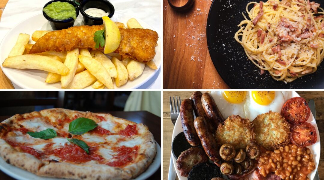 Toppbild. Vad är godast? fish and chips och english breakfast eller pasta carbonara och pizza? Foto: Wikimedia Commons