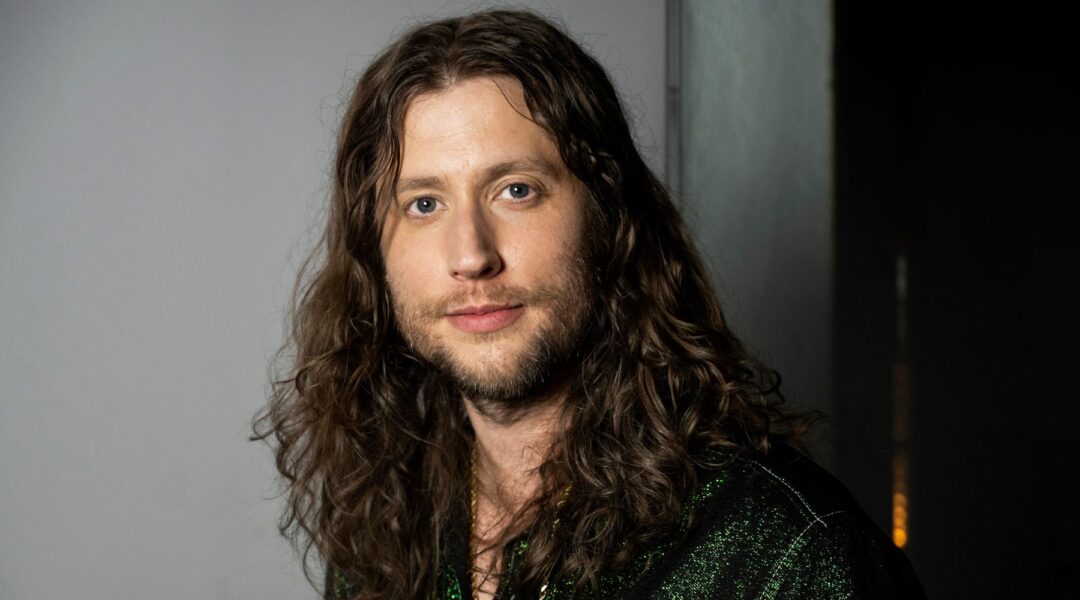 Ludwig Göransson är klädd i en rostbrun kostym och har någon sorts fyrkantigt formade svarta skor på fötterna. Det långa håret hänger ner över axlarna.