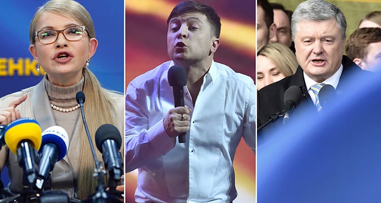 Det är förmodligen bland tre kandidater som avgörandet står om vilka två som går vidare till den andra valomgången: sittande presidenten Petro Porosjenko, den internationellt välkända politikern Julia Tymosjenko samt komikern och uppstickaren Volodymyr Zelenskyj. En tänkbar utmanare till dessa tre kan vara förre försvarsministern Anatolij Hrytsenko som i vissa opinionsundersökningar snuddat vid 10 procents stöd.