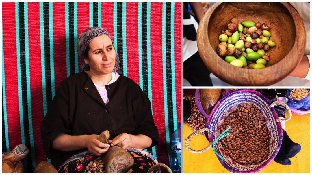 Hon visar oss in i ett mörkt och svalt rum varifrån det hörs ett repetitivt knackande. På stengolvet ligger vackra mattor och på dem sitter en handfull kvinnor med berg av arganfrukter framför sig. Med en sten slår de sönder frukt efter frukt för att få ut de åtråvärda fröerna som oljan utvinns ur. Samtliga kvinnor tillhör berberfolket.