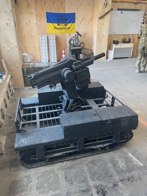 Användningsområdena skiftade. Här på gården monterade man just en markdönare med en kulspruta. Markdrönare kan också lägga ut minor och de kan användas till att transportera skadade. En stridssjukvårdare som släpar en sårad med sig blir ett lätt byte för fiendens drönare. Flaket till sjukvårdsdrönare jag såg hade ett slags rundad pulka ovanpå och spännen så den sårade inte ramlade av.