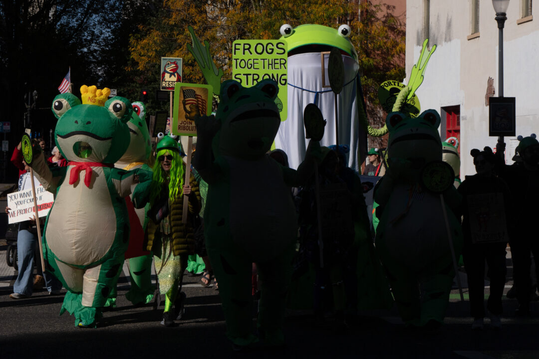 I protesterna mot ICE kom de avväpnande grodorna tillbaka. Folk i uppblåsbara ilsket gröna grodkostymer öga mot öga med maskerade ICE-agenter som skjuter tårgas, pepparsprej och chockgranater mot medborgarna.